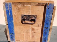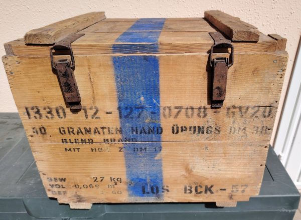 Alte Lagerkistste der Bundeswehr, gebraucht, mindestens 50 Jahre alt, Materalstärke etwa 2cm, ca. Maße 48cm breit x 40cm hoch x 38cm tief, 2 Metallspannbügel-Verschlüsse an der Vorderseite, 2 Metallscharniere, 2 seitliche Metall Tragegriffe, nähere Details siehe Aufschrift, Deckel nach oben aufklappbar, Unikat. 60,- € oder bestes Angebot,