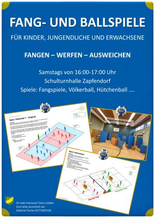 Wir sind am Samstag von 16-17 Uhr in der Schulturnhalle Zapfendorf und spielen Völkerball, Hütchenball, Merkball, Fangspiele, Takeshi...