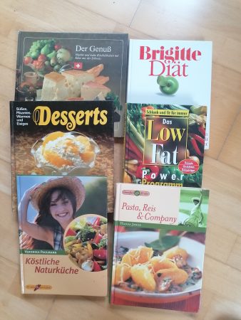Zudem habe ich noch verschiedene Sach und Kochbücher. z.B. Unbeschwert Essen. Das Low-fat-Power-Programm: schlank und fit für immer. Brigitte-Diät, 1000-Kalorienprogramm zum Schlank werden u. Schlank bleiben, Desserts, Süßes Pikantes Warmes und Eisiges, Der Genuss: warme und kalte Köstlichkeiten mit Käse aus der Schweiz. Pasta, Reis Company von Hanna Jakob, Köstliche Naturküche von Veronika Paulmann, Gesund mit Heilkräutern Großmutters Wissen.