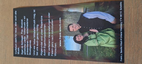 Das Gesangs-Duo Corfelium mit Gitarrenbegleitung aus Scheßlitz gastiert am 9.5.2026 ab 20 Uhr in der Galerie Ambiente in Kronach. Das Duo hat wunderbare Lieder aus vielen Musik-Genres im Repertoire, auch Eigenkompositionen wie die zauberhafte Ballade "Regenbogenlicht".