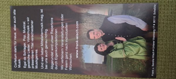 Wir sind das Gesangsduo Corfelium mit Gitarrenbegleitung aus Scheßlitz und haben wunderbare Lieder aus vielen Musik-Genres im Repertoire, z.B. Chansons, Schlager, Pop, Musical, Volksmusik und auch Mittelalter.