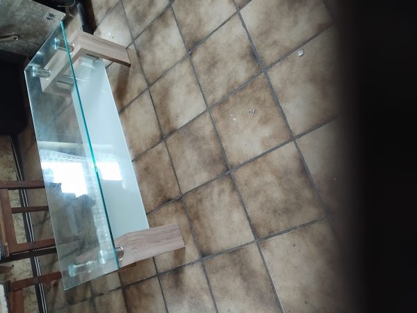 Die Tischplatte ist aus dickem, klarem Glas und in sehr gutem Zustand – keine Risse oder größeren Kratzer. Ideal fürs Wohnzimmer oder Büro.