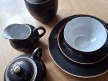 96129 - Strullendorf 10. September 2025 Teeservice für 3 Personen, matt-schwarz mit goldfarbenem Dekor Teeset für 3 Personen: 3 Tassen mit Untertassen, 3 Teller, 1 Milchkännchen, 1 Zuckerdose, 1 Teeurne;...