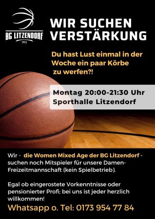 Wir, die „Women Mixed Age“ (Damen-Freizeitmannschaft Basketball) der BG Litzendorf, suchen Verstärkung für unser Team! Wir sind zwischen 30-50 Jahre alt, spielen just for fun und haben keinen Spielbetrieb. Training ist immer montags von 20-21:30 Uhr in der Ellertalhalle in Litzendorf. Bei uns sind Anfänger und Profis willkommen! Wenn du Lust hast, mal bei uns zu „schnuppern“, melde dich gern bei mir.