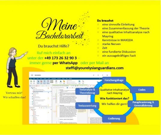 Du schreibst gerade deine Bachelorarbeit, Masterarbeit oder deine Dissertation. Und jetzt sollst du dein Datenmaterial mit der Software MAXQDA auswerten und brauchst dabei einfach ein bisschen Hilfe? Ich unterstütze dich gerne bei der Erstellung eines Kategoriensystems und bei der Auswertung oder der Interpretation deines Datenmaterials.