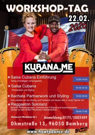 Kubáname, das sind Yorge und Steffi, sehr bekannt insbesondere durch ihre tollen Videos auf Facebook, werden unsere Räume mit kubanischer Musik und Lebensfreude füllen. Alle, die bisher hauptsächlich Salsa L.A.Style gelernt haben, bekommen die Chance, authentische Salsa Cubana zu tanzen, mit unglaublich charismatischen Lehrern. Außerdem werden die beiden einen Bachata Workshop leiten, auch hier überzeugen sie durch ihre Musikalität, Partnerwork und Styling. Last but not least werden sie den Reggaeton Solotanz nach Bamberg bringen. Er besticht durch ausdrucksstarke Gesten zu rhythmischem Fußspiel.