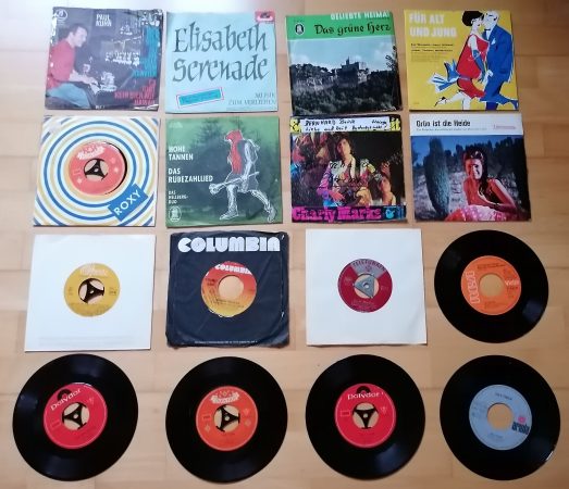 Singles aus den 60/70ziger Jahren und älter, einzeln mit Cover ab 2,- € pro Stück, ab 50 Stück aus Album 1,- € pro Stück, 3 Alben mit z.B. Rolling Stones, Beatles, Trini Lopez, The Lords, Casey Jones, Nany Sinatra usw., Singles ohne Hülle haben teilweise altersentsprechende Gebrauchsspuren. LP´s sind neuwertig und haben keine Kratzer, 8 LP´s (Bild 9) sind noch original eingeschweißt.