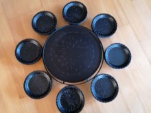 Passend dazu verkaufe ich 1 Drehkarussell aus Schmiedeeisen mit Halterungen für 8 Schalen, zum drehen, praktisch zum Anrichten, für einen übersichtlich gedeckten Tisch. Ideal für Fondue, Raclett, oder auch für Fingerfood, alles was mit Feinkost, Soßen und Dips serviert wird und für vieles mehr. Kein herumreichen der Schalen, nur drehen und jeder bekommt ganz einfach und bequem was er gerne mag.