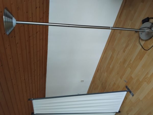 Schlichte Stehlampe in Silber mit rundem Standfuß.