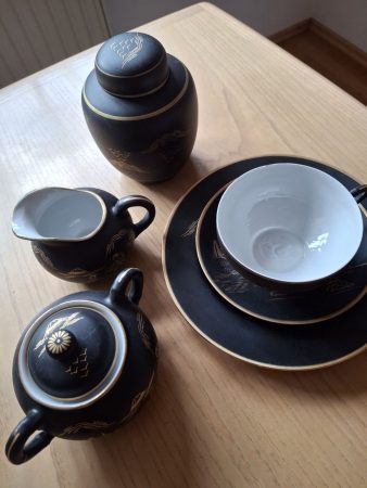 Teeset für 3 Personen: 3 Tassen mit Untertassen, 3 Teller, 1 Milchkännchen, 1 Zuckerdose, 1 Teeurne; nicht Spülmaschinenfest. Porzellan, matt-schwarz mit goldfarbenem Dekor. Preis: 15 €. Nur Abholung mit Barzahlung. Die Ware wird unter Ausschluss jeglicher