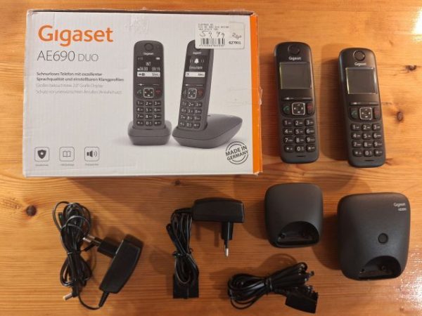 Verkaufe schnurloses Telefon-Set „Gigaset AE 690 Duo“. Gehäusefarbe anthrazit. Das Geräte-Set hat keinen integrierten Anrufbeantworter, man könnte alternativ z.B. die virtuelle Telekom-SprachBox, die in den meistens Telekom-Festnetztarifen kostenlos enthalten ist, nutzen. Das hier angebotene Set stammt aus einer Haushaltsauflösung. Die Geräte waren ausgepackt, mit Sicherheit aber nie angeschlossen und benutzt worden. Makelloser Zustand, keinerlei Nutzungsspuren. Unverbindliche Besichtigung gerne möglich. Festpreis 15€ (Neupreis war lt. Preisetikett 59,99€). Selbstabholung, bei Versand zzgl. 5€ Porto und Vorabüberweisung erbeten. Tel. 0951/53970 (AB).