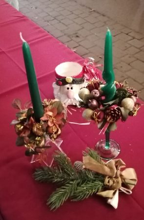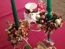 2 Kerzenhalter Kristall, mit grünen Kerzen und winterlicher Deko, je 15,- €