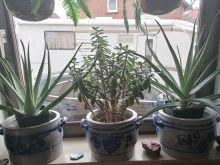 Ich verkaufe z.B. Geldbäumchen Crassula ovata in verschiedenen Größen, Jadestrauch Crassula horntree auch in verschiedenen Größen, Klivie, blüht orange, Elefantenohr, Haemanthus albiflos, blüht weiß, 1 große Aloe Vera.