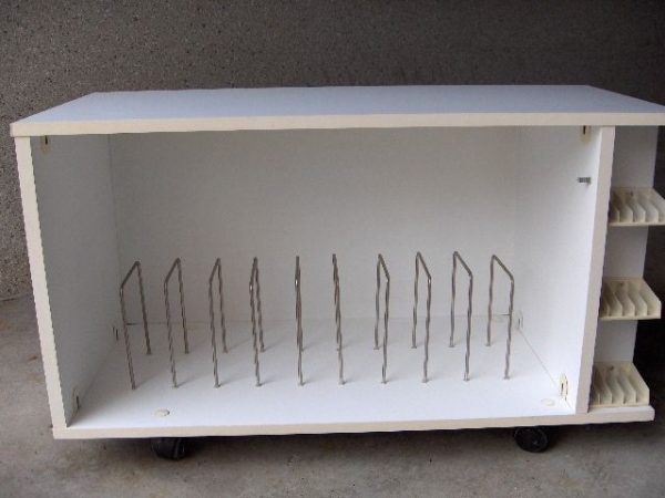 T40, Farbe weiß, Halterungen für MC`s können leicht abgeschraubt werden, somit kann das Fach auch anderweitig genutzt werden.