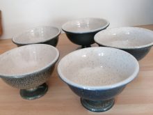 Vintage Keramik Rumtopf made in W. Germany, Maße 32 cm - Höhe mit Deckel 23 cm, 17,5 cm Durchmesser, 5 L – Fassungsvermögen, 4 Keramikschalen 12 cm, braun, ideal zum überbacken und servieren von Gerichten, Gallo Brasilia. Die Glasur ist für starke Beanspruchung im Backofen und Mikrowelle geeignet. 5 Keramikschalen mit Fuß von Stoißer Austria 9 cm hoch und 14 cm Durchmesser. Alle Sets sind neuwertig, wurden wenig benutzt und zeigen keinerlei Gebrauchsspuren.