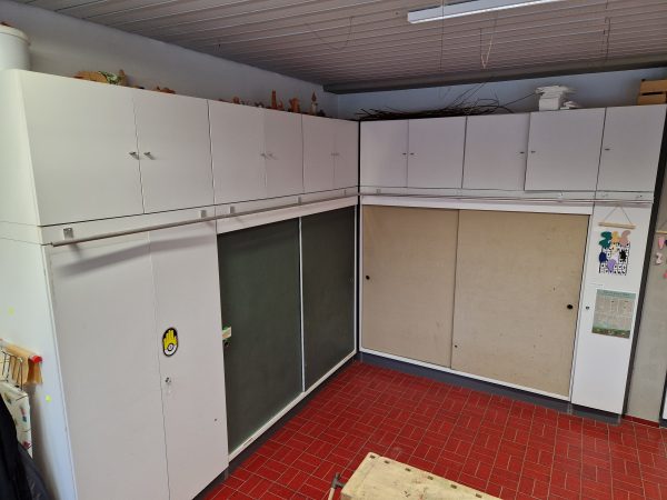 Wandschrank zweiteilig aus einem Werkraum, Höhe 280 cm, Breite links 330 cm, Breite rechts 260 cm, Tiefe 57 cm, gegen Abbau zu verschenken